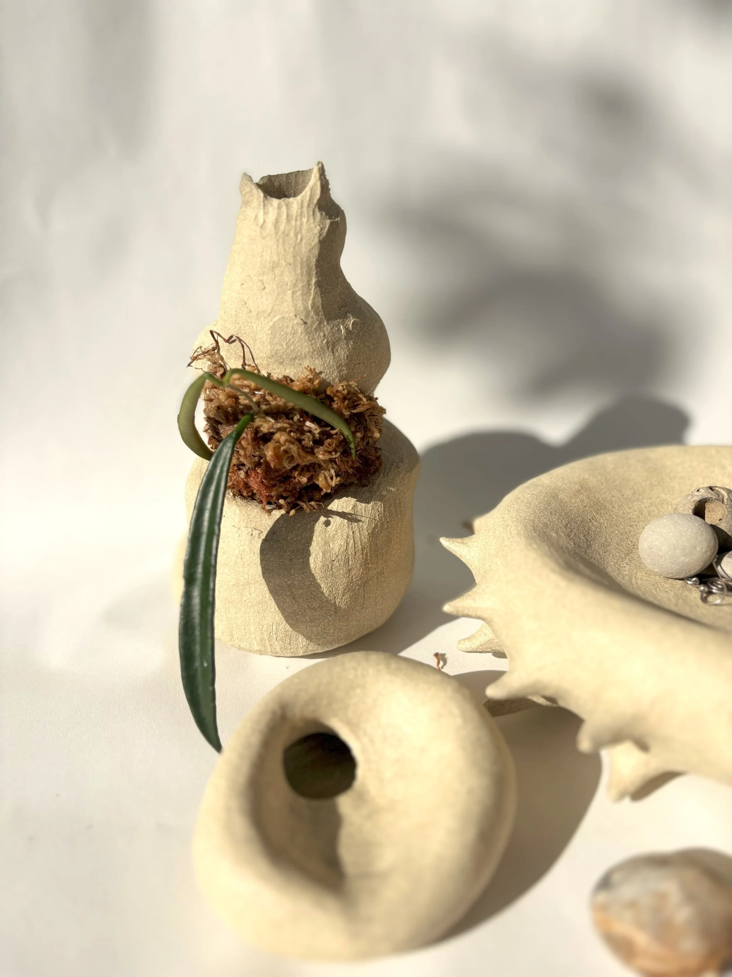 This series of stoneware was brought about by the desire to sculpt; the pull to create work that considers both functional needs of epiphytic plant substrate and organic forms of clay bodies.